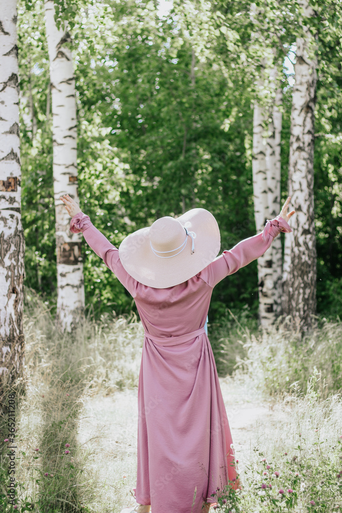Muslim Woman With A Hat In A Pink Dress And A Blue Hijab With A Picnic